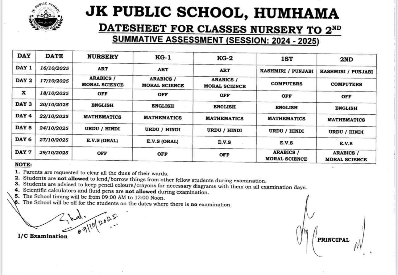 DATESHEET OF SUMMATIVE ASSESSMENT FOR CLASSES NURSERY TO 2ND
