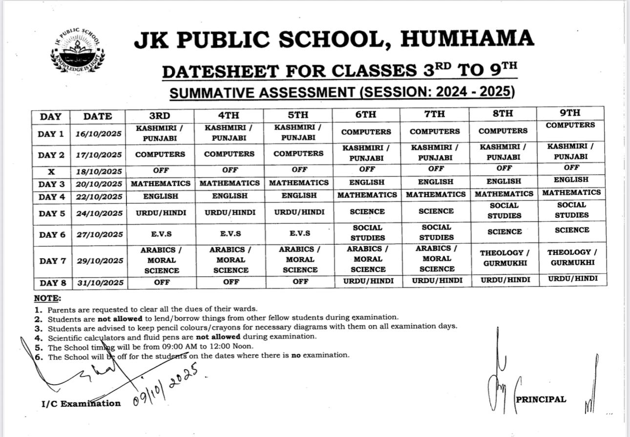DATESHEET OF SUMMATIVE ASSESSMENT FOR CLASSES 3rd TO 9th